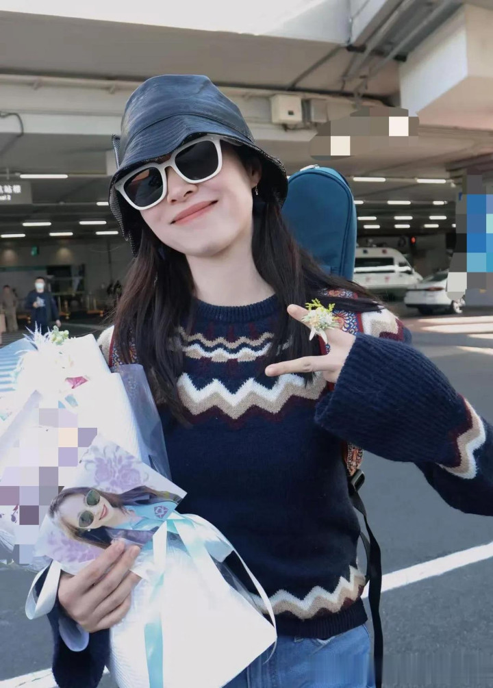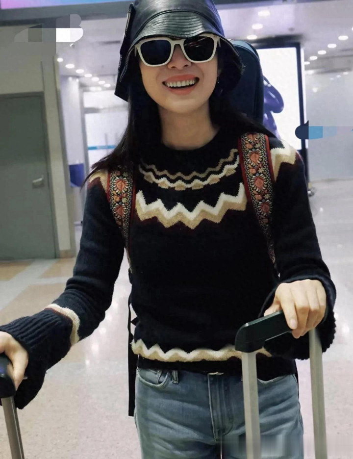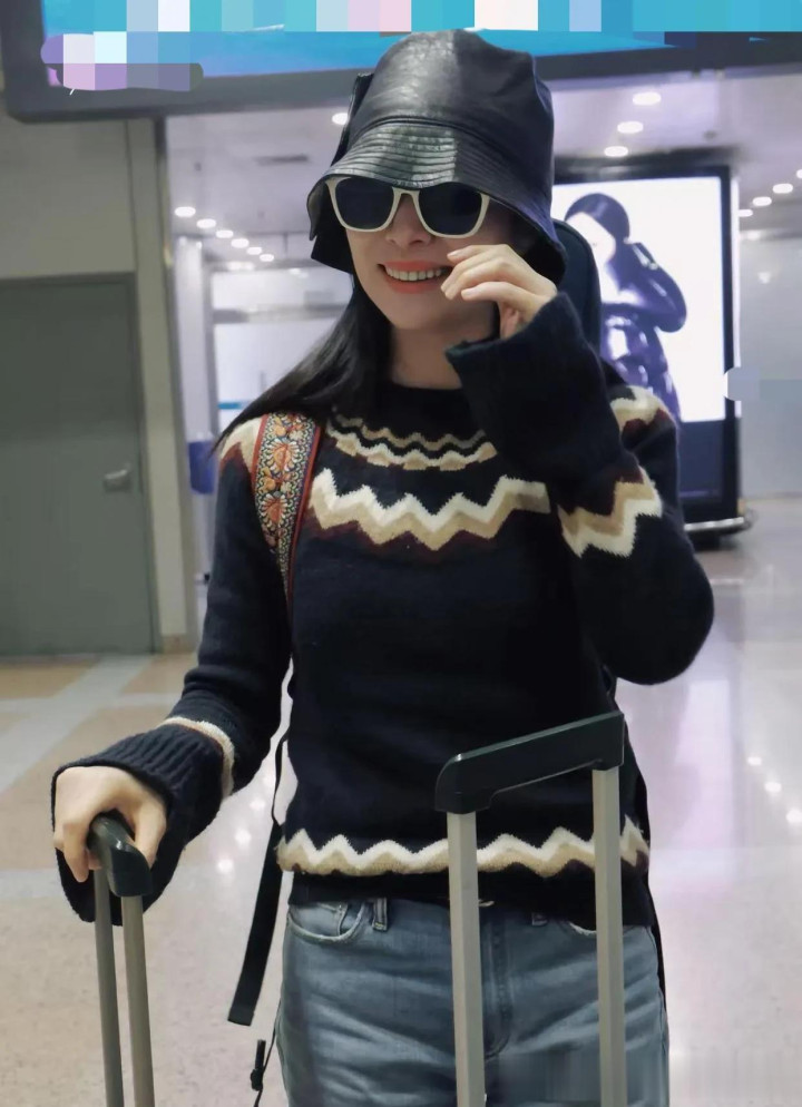 江一燕机场私服真时髦! 提花毛衣+牛仔裤+渔夫帽, 减龄又高级!